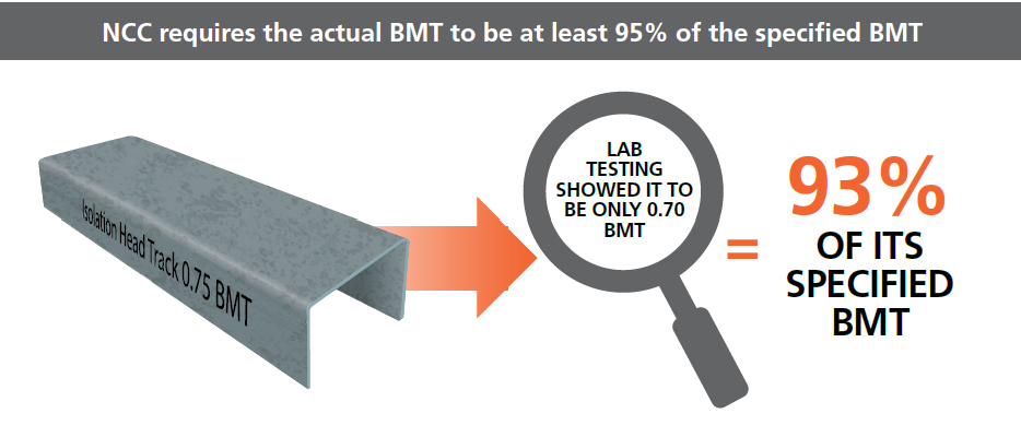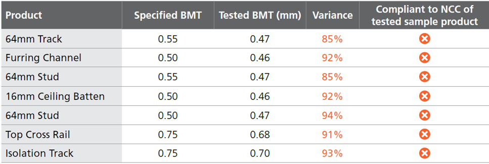 In our First Edition released last year, independent testing uncovered that several imported steel wall and ceiling products from China fell short of NCC compliance, by failing to meet the AS/NZS 4600 requirement for cold-formed steel to be at least 95% of its specified base metal thickness (BMT).
